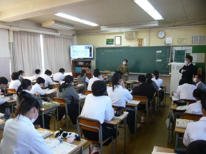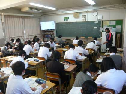 3限、2年1組は理科、回路図を書いています。2年2組は英語、空港のアナウンスについて学習します。実用的な英語学習です。