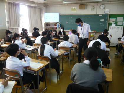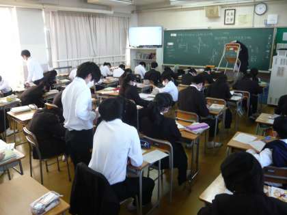 3限、1年1組は理科、凸レンズの光の進み方について学習しています。1年2組は数学、反比例のグラフについての学習です。
