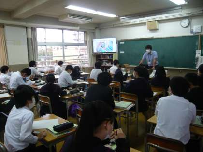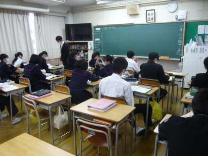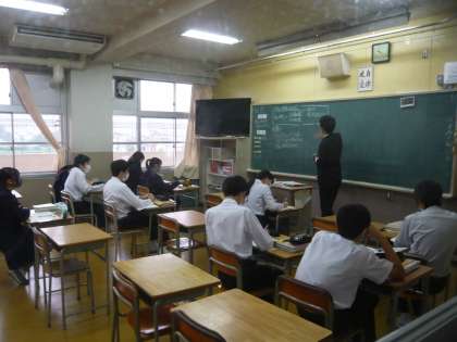 2限、3年1組は社会、授業の始まりは「15問チャレンジ」からです。3年2組は数学分割授業、変化の割合を求める学習です。