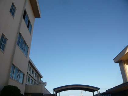 10月28日(木)、快晴の朝です。いつも同じ位置から撮影していますが、太陽はすっかり校舎に隠れてしまいました。