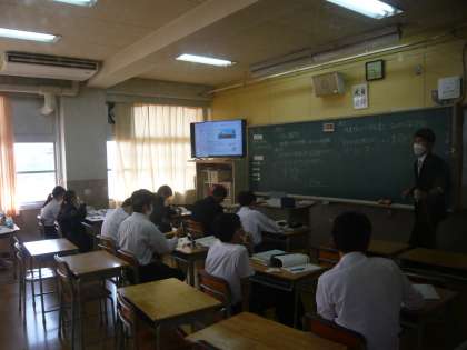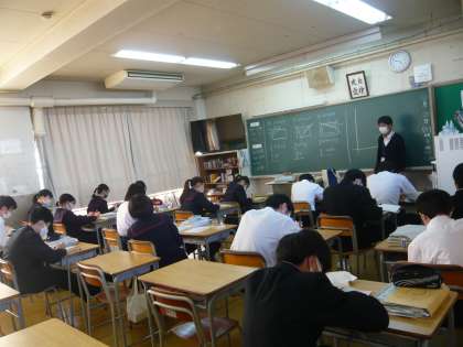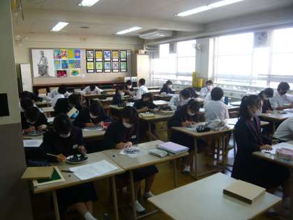1限、3年1組は美術、陶芸スクラッチに取り組んでいます。3年2組は数学分割授業、動点の問題を解いていました。