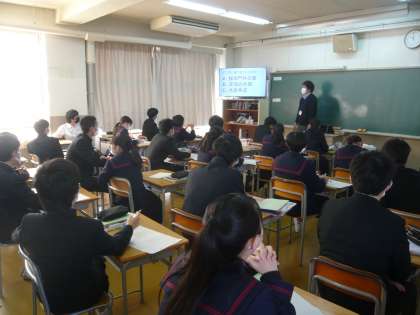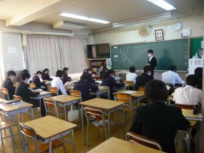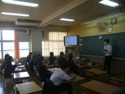 2限、3年1組は社会、「15問チャレンジ」に取り組んでいます。3年2組は数学分割授業、放物線と直線の交点の座標についての問題を解いています。