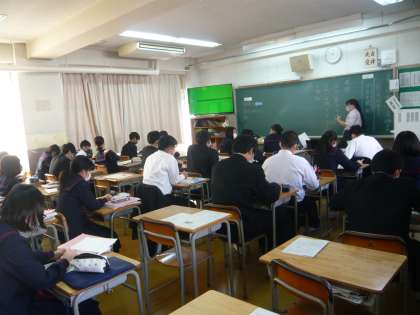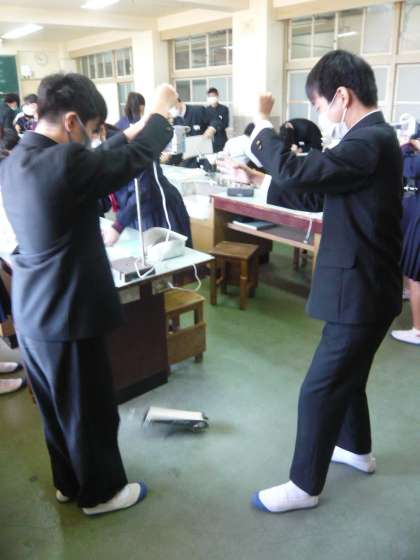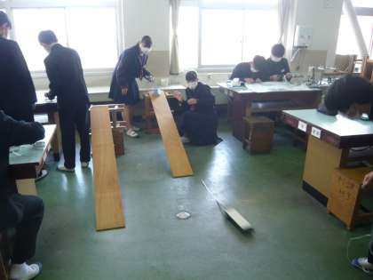 2限、3年3組は理科、記録タイマーを使って物の落下や傾斜を滑り降りる速度を測る実験をしています。3年4組は国語、「おくのほそ道」の学習です。