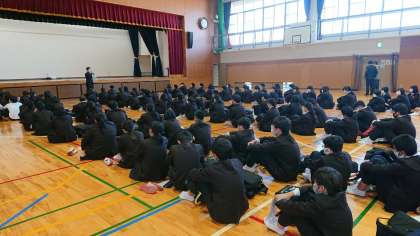 明日出発の宿泊学習に向けて、体育館で前日注意を行っています。