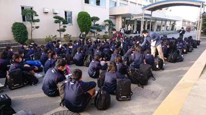 おはようございます。今日から2年生は滋賀県で1泊の宿泊学習です。集合時間となり、ただいま検温中です。