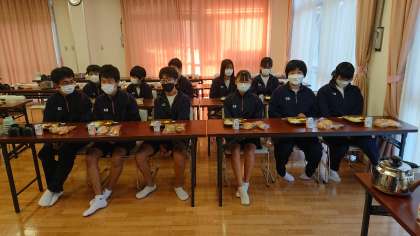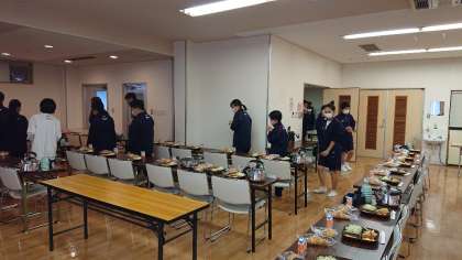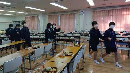 朝食の準備です。クラスごと、班ごとに決められた席に座っていきます。