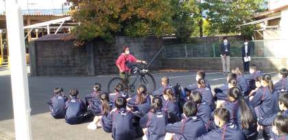 マウンテンバイクの乗り方の説明を聞いています。もうすぐサイクリングに出かけます。