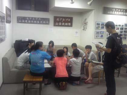 楽しいレクが終わり、班長さんが集まってミーティングをしています。