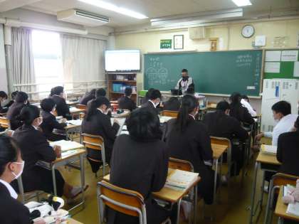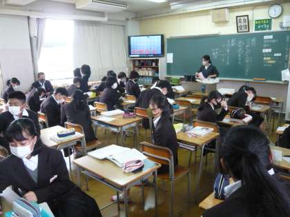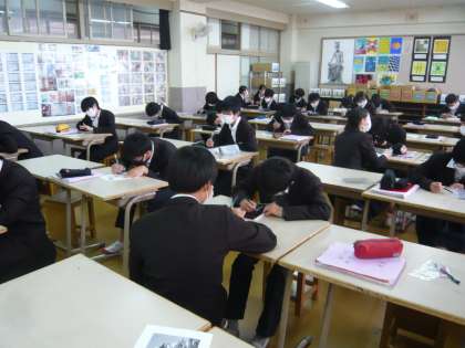 3限、2年1組は美術、点描画です。2年2組は理科、電気回路の学習です。2年3組は国語、漢詩の問題に取り組んでいます。