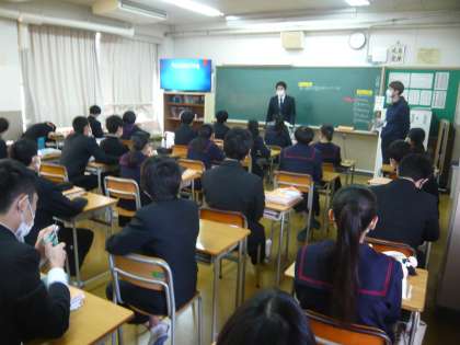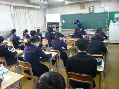 2限、3年1組は英語、AETの先生とTTの授業です。3年2組は理科、太陽の南中高度の求め方について学んでいます。