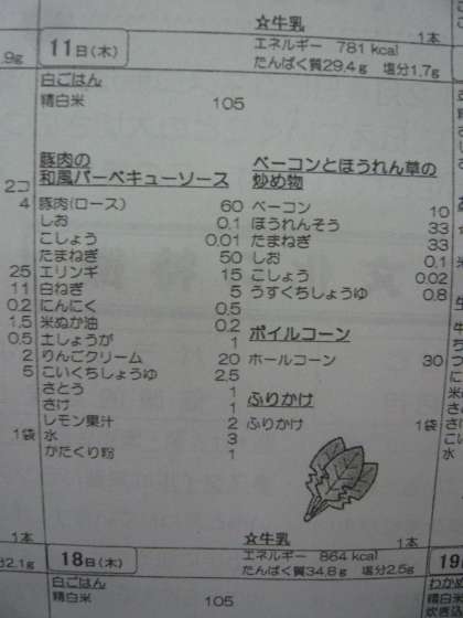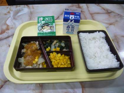 本日の給食の献立は、白ごはん、豚肉の和風バーベキューソース、ベーコンとほうれん草の炒め物、ボイルコーン、ふりかけ、牛乳です。