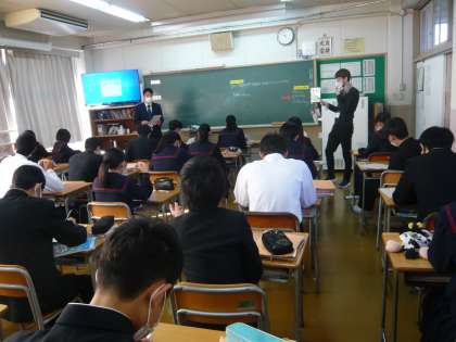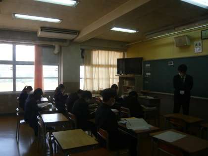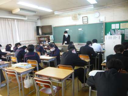 2限、3年1組は英語、AETの先生について単語の発音の練習をしていました。3年2組は数学分割授業、関数の問題を解いています。