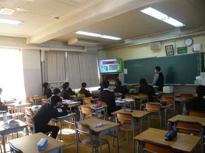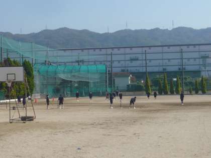 2限、2年3組男子は保健、心肺蘇生法について学んでいます。女子は体育、グラウンドでティボールの授業です。