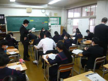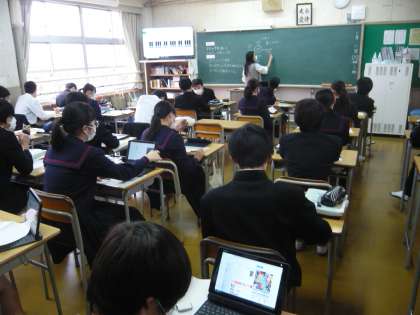 2限、3年1組は英語、テスト対策のプリントをやっています。3年2組は音楽、タブレットを活用してメロディをつくるようです。