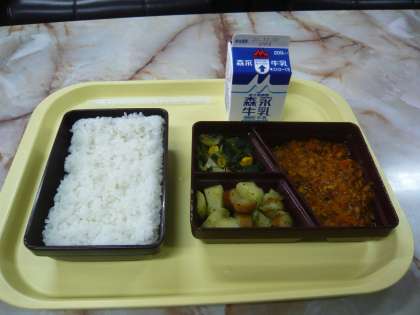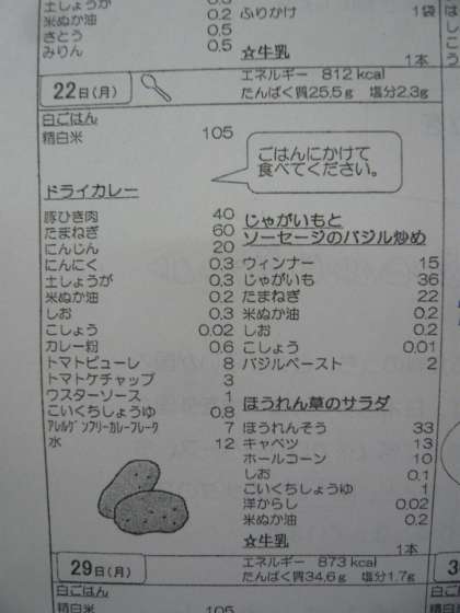 本日の給食の献立は、白ごはん、ドライカレー、じゃがいもとソーセージのバジル炒め、ほうれん草のサラダ、牛乳です。