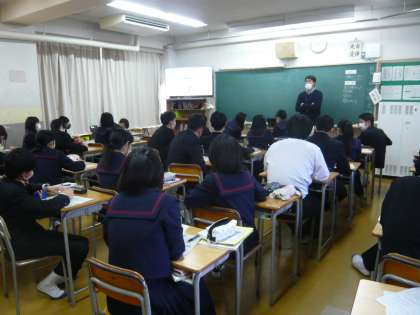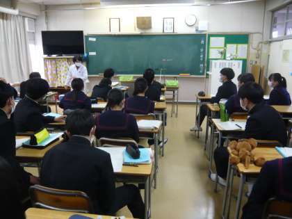 2限、3年3組は理科、「仕事」について学習しています。3年4組は社会、「15問チャレンジ」の答え合わせをしていました。