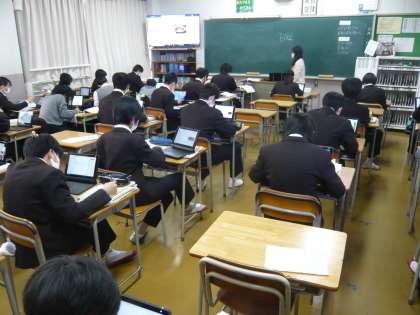 2限、2年1組は国語、日本文化についてテーマを決めてレポートを作成するようです。2年2組は理科、電流が流れたときの磁界の向きを考えています。