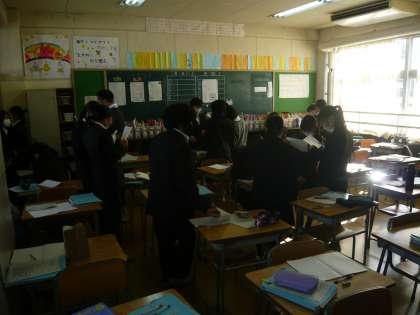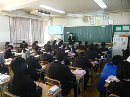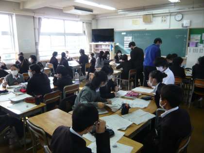 2限、1年1組は総合、人権学習をしています。1年2組は国語、口語と文語について学習していました。1年3組は英語、過去形の疑問文を使って、仲間に過去の話をたずねているところです。