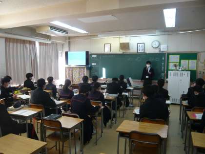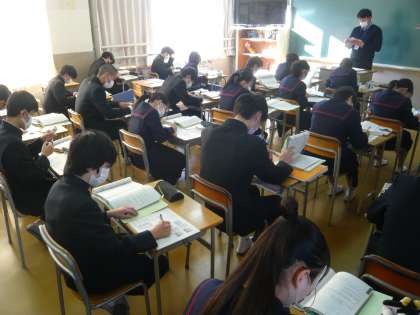 1限、3年1組は社会、今日は確認テスト(単元テスト)があるので、それに向けて勉強しています。3年2組は数学、三角形の相似について学習しています。