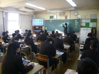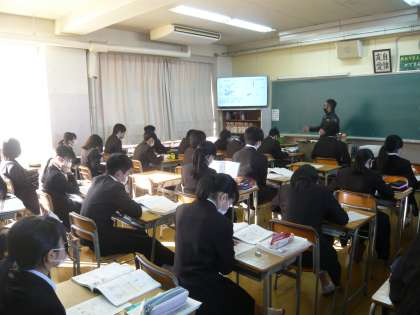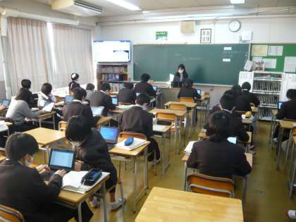 1限、2年1組は国語、日本の文化をテーマにレポート作成です。2年2組は社会、幕末から明治維新の歴史を学んでいます。2年3組は理科、磁界の学習です。