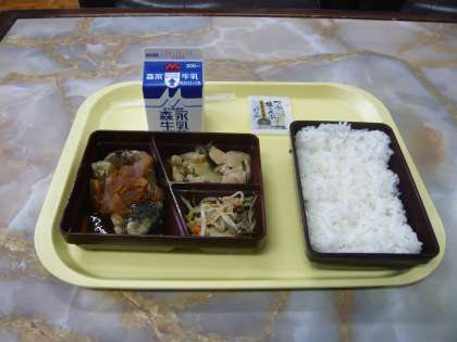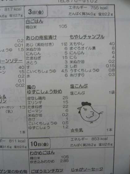 本日の給食の献立は、白ごはん、あじの南蛮漬け、鶏のゆずこしょう炒め、もやしチャンプル、塩こんぶ、牛乳です。