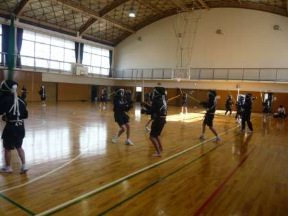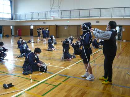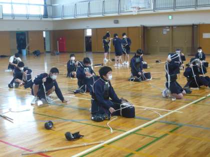 3限、2年1・2組男子体育は、体育館で剣道の授業です。防具のつけ方から学んでいます。