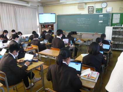 2年3組は国語、タブレットを使って日本文化のレポートを作成しています。そばにいた生徒に聞いてみると、彼のテーマは「座布団」とのことでした。