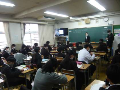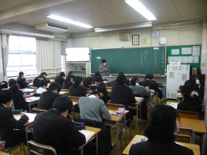 2限、1年1組は英語、過去の表現を用いて文を作ります。1年2組は国語、名詞についての学習です。1年3組は理科、火山と鉱物について調べています。