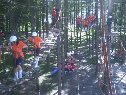 一方、2組と3組はアドベンチャーです。ゴール地点に登ってみましたが、二階の高さで揺れるロープや棒の上を歩いている姿にびっくりです。挑戦すること自体信じられません!