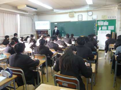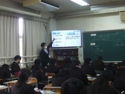 1限、1年3組でミニグループ研修として社会科の研究授業を行いました。