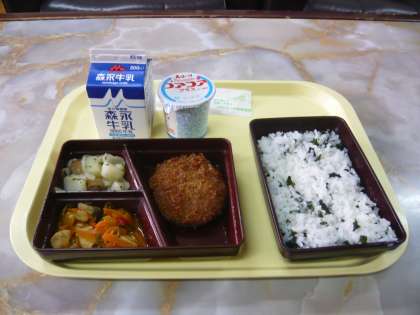 本日の給食の献立は、わかめごはん、ごぼうミンチカツ、じゃがソーセージ、ヨーグルト、牛乳です。