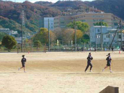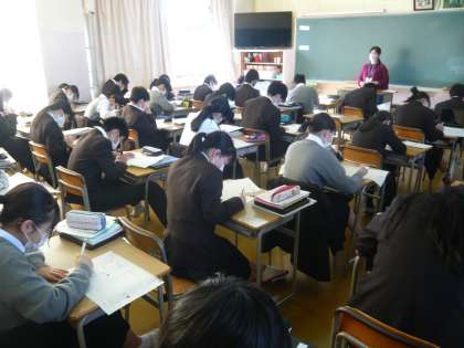 3限、2年1・2組の女子体育は、持久走です。今日も精いっぱい走っています。2年3組は英語、復習プリントに取り組んでいます。
