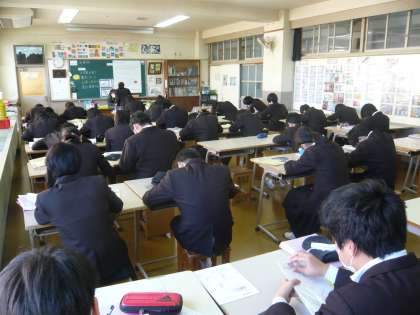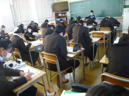3限、2年1組は美術、点描画が徐々に仕上がってきました。2年2組は理科、単元テストに向けて勉強中です。2年3組は国語、文章問題に強くなることが今日のめあてです。