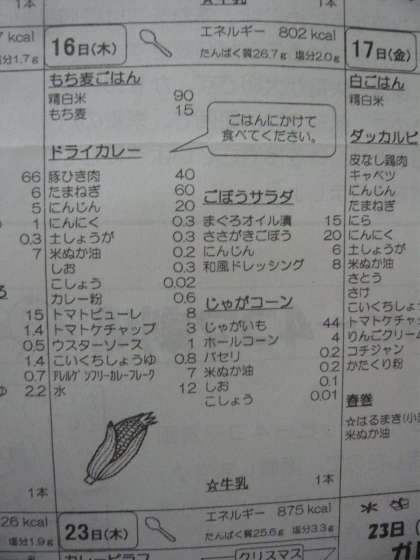 本日の給食の献立は、もち麦ごはん、ドライカレー、ごぼうサラダ、じゃがコーン、牛乳です。