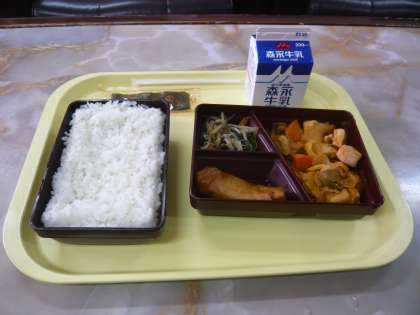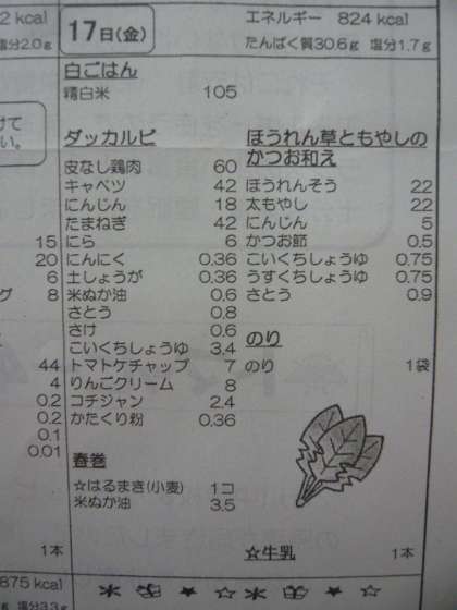 本日の給食の献立は、白ごはん、ダッカルビ、春巻、ほうれん草ともやしのかつお和え、のり、牛乳です。
