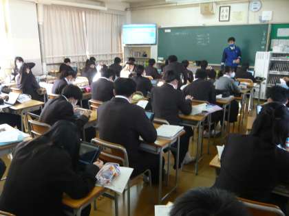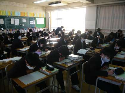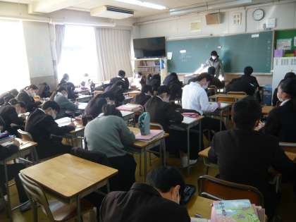 1限、1年1組は国語、書写の本を出しています。書初めの話?かもしれません。1年2組は理科、「火山新聞」というのを作っています。1年3組は数学、平面図形の移動について考えています。