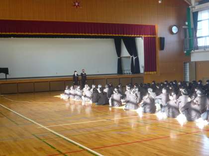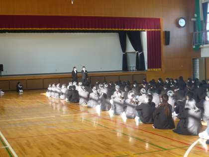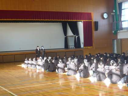 2限、1年生は、体育館で学年集会を行いました。各クラス学級委員から2学期の反省を発表するなどしていました。