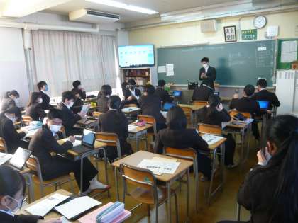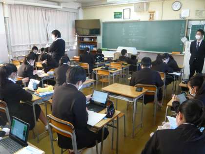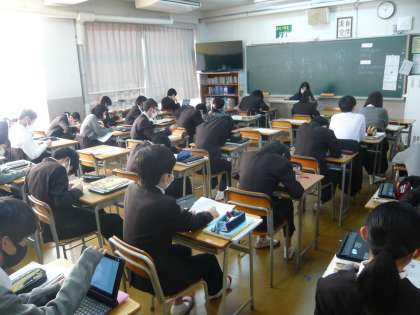 2限、2年1組は国語、行書のプリントに取り組んでいます。完成したら冬休みの宿題をやってもよいことになっています。2年2組は数学、2年3組は社会、ともに冬休みの宿題についてです。