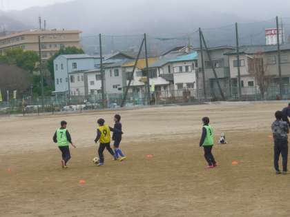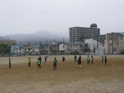 グラウンドでは、小雪舞う中、サッカー部が練習しています。