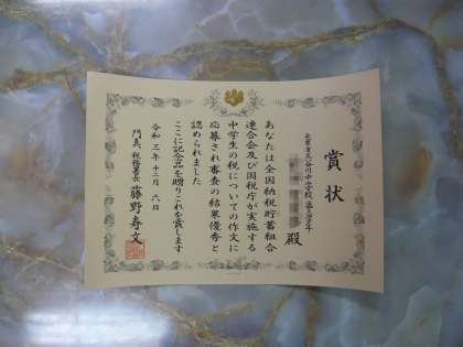 3学期始業式を行いました。開式に先立って、「税についての作文」の表彰をしました。門真税務署長からの立派な賞です。