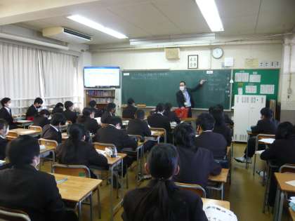 3限、1年1・2組は体育、女子は剣道、男子は持久走です。寒い中、がんばっています。1年3組は英語、「〜していました」という表現を学んでいます。