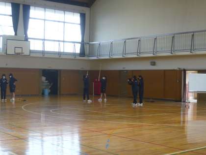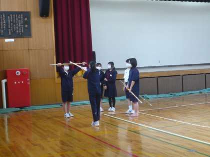 3限、3年3・4組は体育。女子は体育館で剣道の授業です。タブレットを使って、グループごとに技(動き)の確認をしています。