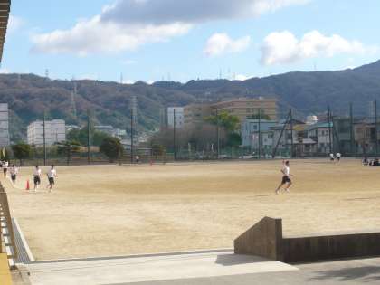 3限、3年3・4組の男子体育は、グラウンドで持久走です。「耐寒走」と言うにふさわしい天候の中、がんばっています。