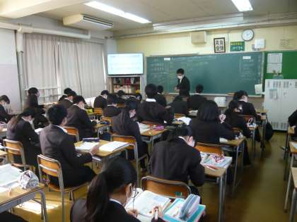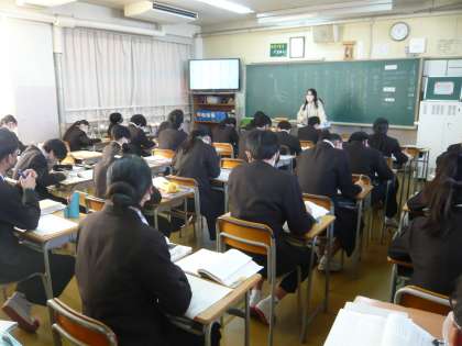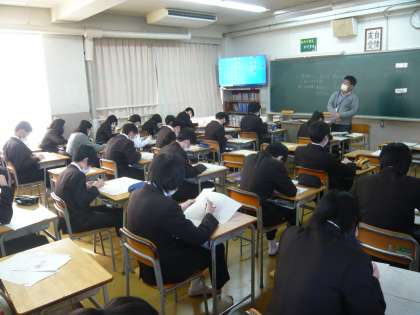3限、2年1組は英語、単元テストに取り組んでいます。2年2組は国語、古典「平家物語」を学習しています。2年3組は社会、明治時代の改革の学習です。