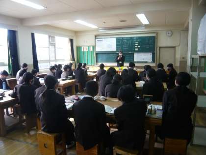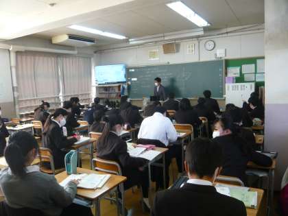 3限、1年1組は数学、空間図形の学習です。1年2組は社会、歴史の授業で武士のおこりを学習しています。1年3組は技術、木工の授業、今日の作業について説明を聞いているところです。