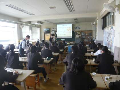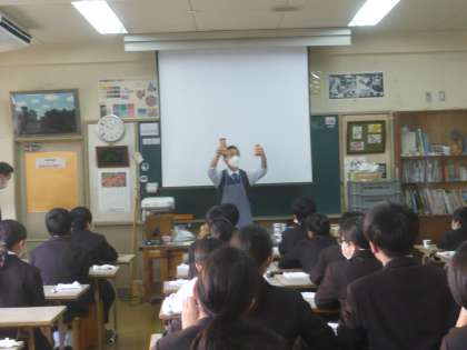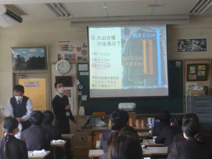 大阪府立近つ飛鳥博物館からゲストティーチャーをお招きして、今日、明日、1年生が出張授業を受けます。今日は1年2組が2・3時間目授業を受けています。