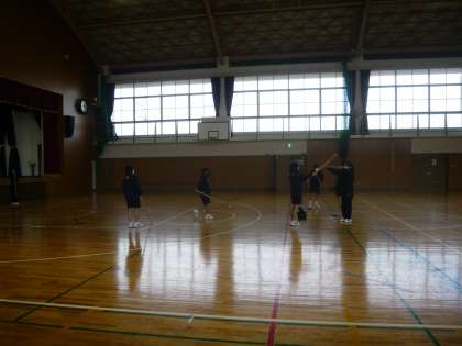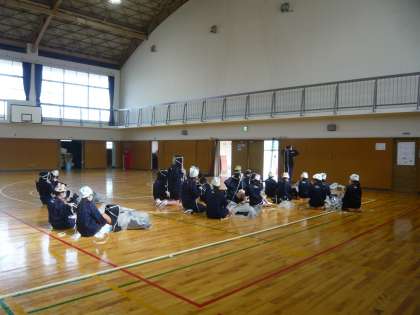 3限、2年1・2組の女子体育は、体育館で剣道の授業です。打ち込みの練習と、面のつけ方を教わっているグループに分かれています。