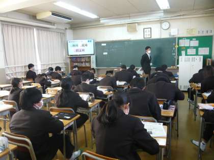 3限、1年3組は社会、歴史の授業で鎌倉幕府のしくみを学んでいます。