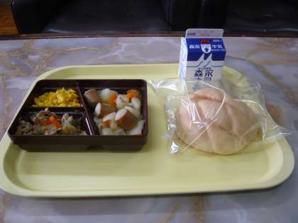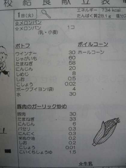 2月最初の献立は、メロンパン、ポトフ、豚肉のガーリック炒め、ボイルコーン、牛乳です。