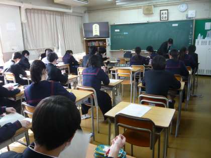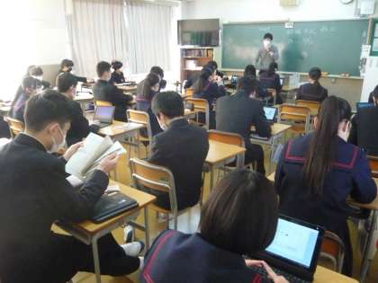 3限、3年1組は技術、自習ですが、タブレットを使ってコップのデザインを考えています。3年2組は国語、室町時代、江戸時代の文学史の学習に入っていきます。